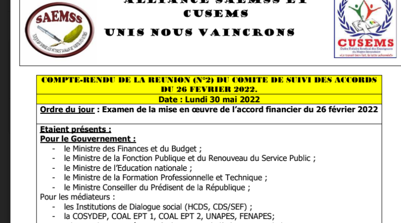 COMPTE-RENDU DE LA REUNION (N°2) DU COMITE DE SUIVI DES ACCORDS DU 26 FEVRIER 2022.