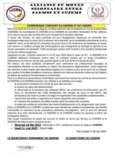 ACTUALITÉS RECENTES CRISE SCOLAIRE COMMUNIQUE CONJOINT DU SAEMSS ET DU CUSEMS. 8 mai 20238 mai 2023 admin4367 Aucun commentaire
