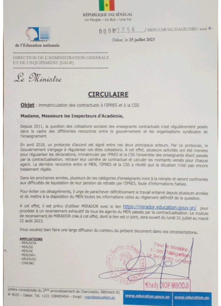 ACTUALITÉS RECENTES FONCTION PUBLIQUE CIRCULAIRE OBJET: IMMATRICULATION DES CONTRACTUELS A L’IPRESS ET A LA CSS. 11 août 202311 août 2023 admin4367 Aucun commentaire